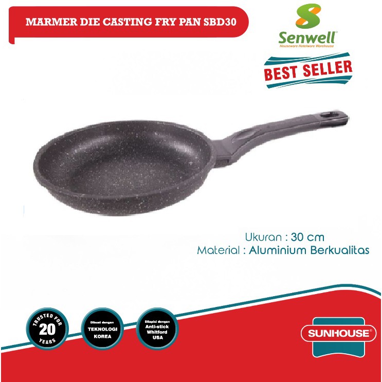Sunhouse SBD30 Marble Frypan Anti Lengket Hitam 30 cm 1 Pcs- Size : Panjang : 52 cm Diameter : 30 cm Tinggi Loyang : 5.9 cm Tinggi Gagang : 9.5 cm Panjang Gagang : 21 cm- Seluruh bagian dalam dan permukaan luar ditutupi dengan lapisan marmer granit yang tahan lama, dan cocok untuk dapur modern. Sangat baik dalam menghantar panas, membantu memasak dengan mudah dan cepat.- Pegangan plastik tahan panas yang tahan lama, dibaut dengan kuat ke badan panci, memastikan keamanan saat digunakan. Ujung pegangan juga dirancang dengan gantungan yang praktis.- Bagian bawah panci dirancang dengan garis konsentris yang dalam, anti selip yang baik, aman digunakan.- Terbuat dari paduan aluminium tebal 3.0mm berkualitas tinggi. Bagian mulut penggorengan yang menebal (5.0mm). Lapisan marmer meningkatkan kemampuan anti-lengket, membatasi pengelupasan serta menghindari kotoran menempel, mudah dibersihkan.- Produk ini dapat digunakan pada banyak jenis kompor: kompor gas, kompor inframerah, tidak dapat digunakan pada kompor induksi.UNTUK PEMESANAN DALAM JUMLAH BANYAK BISA HUBUNGI VIA PESAN INFORMASI :-Berat yang tertera pada produk kami adalah berat volume packing, bukan berat riil barang-Periksa kembali pesanan anda (Nama, Alamat, No Telepon, dan Kolom Keterangan)Yang berminat menjadi Reseller dan Dropshipper bisa hubungi via pesanKetentuan belanja di Senwell :1. Dropshipper harap menuliskan nama pengirim pada memo, Alamat yang tertera = alamat customer anda2. Chat akan dibalas maximal 1 x 24 jam. Harap bersabar.3. Garansi pengiriman berlaku dengan syarat, maksimal 3 hari setelah diterima dan review 4 bintang4. Info mengenai pengiriman agar volume tidak berbeda dengan berat barang. Untuk pertanyaan seputar hal ini silahkan chat admin Happy Sho