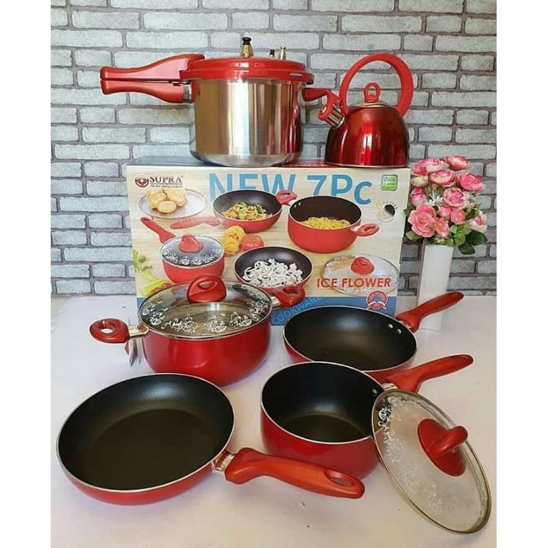 PAKET SET PANCI SET TERDIRI DARI :1.PANCI SUPRA SET 7PCSisi :1pcs panci gangang 18cm1pcs tutup kaca panci gangang 18cm1pcs panci kuping dua 24cm1pcs tutup kaca panci kuping dus 24cm1pcs wajan gangang 24cm1pcs steamer 24cm1pcs frypan / dadaran 24cm panci ini berbaham teflon coating 3 lapis , tidak mudah terkelupas dan bahan sangat berkualitas.2.PANCI PRESTO SUPRA 8 LITERisi:1pcs panci presto1pcs tutup panci presto1pcs karet panci presto yang sudah terpasang1pcs karet panci presto yang belum terpasang1pcs peluit panci1pcs steamerpanci presto supra ini berbahan stenlis tebal dengan handel yang kuat aman dan nyaman saat di pakai memasak , dilengkapi juga dengan karet cadangan yang tidak di miliki presto merek lain.3.TEKO BUNYI SUPRA 2LITERisi:1pcs teko1pcs tutup tekoteko ini berbahan stenlis steel anti karat dan mudah di pakai , dengan handel yang anti panas sehinga memudah kan saat memasak .Tidak free bungga ya