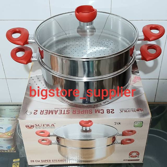 Steamer SUPRA susun 2 dengan ukuran 28cmterbuat dari material stainless steel sangat tebal...sangat cocok untuk dijadikan alat pengukus atau memanaskan berbagai macam kue basah atau pun dimsum dan lain
