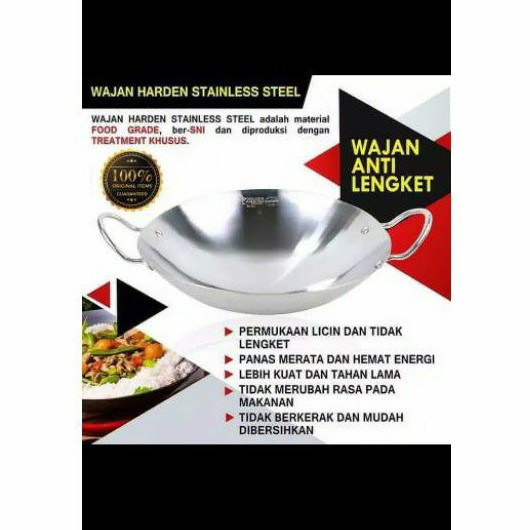 Golden Flying Fish Harden Stainless Steel 38 CmInovasi terbaru dari Golden Flying Fish, Wajan Stainless Steel Harden. Diproduksi dengan treatment khusus yang membuat wajan menjadi tidak lengket saat menggoreng (namun harus tetap menggunakan minyak).Wajan ini menggunakan material Stainless 430 yang memilikiSertifikat SNI 8752:2019Kelebihan Wajan Wok Stainless Steel Golden Flying Fish:- Food grade- Bersertifikat SNI 8752:2019 (Standar Nasional Indonesia)- Tidak lengket. Panas lebih merata dan hemat energi- Higienis dan mudah dibersihkan.- Hemat energi karena lebih cepat panas- Lebih tebal, kuat, dan tahan lama. Tidak rontok saat proses memasak- Tidak mengubah rasa atau menimbulkan reaksi kimia pada makanan yang dimasakCara Memakai Wajan Harden1. Panaskan wajan dengan api kecil2. Tuangkan minyak goreng ke dalam wajan3. Oleskan & ratakan minyak4. Tunggu sampai minyak menjadi panas (keluar asap)5. Wajan sudah siap digunakanPeringatan1. Jangan panaskan wajan kosong dengan api besar untuk menghindari gosong. Bahan stainless sangat cepat panas. Cukup api kecil saja jika ingin memanaskan minyak.2. Jangan biarkan kompor dalam kondisi menyala saat mengangkat masakan yang telah matang.3. Permukaan wajan yang gosong adalah hal wajar (bukan karat). Setelah dipakai berulang kali dengan pemanasan yang cukup, warna gosong akan menjadi samar.4. Penyebab lain wajan cepat gosong adalah burner (tempat keluar api) kompor yang kotor sehingga menghasilkan api yg tidak merata, sisa kotoran sekitar burner yang ikut terbakar & menciptakan gosong.5. Harap cek kebersihan kompor agar semua wajan lebih awet & masakkan menjadi lebih higienis.Cara Mencuci Wajan1. Jika muncul kerak atau gosong, cuci wajan dengan sabut stainless & sabun cuci piring. Gosok secara halus untuk menghindari baret pada permukaan wajan.2. Selesai dicuci, langsung keringkan wajan untuk menghindari noda air & simpan di tempat yang kering.tips:jangan menggunakan api besar ketika memasak.. gunakan api kecil saja krn stainless cepat pa