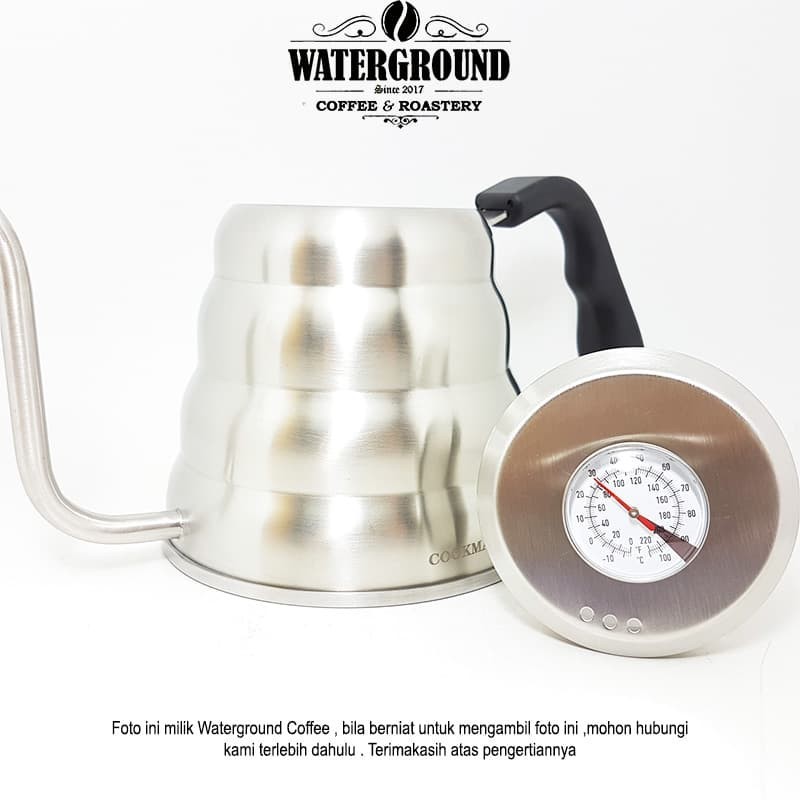 Deskripsi Gooseneck Kettle 1000mL dengan termometer Teko Leher Angsa V60 ToolsDear Coffee Lovers,Buat kamu yang uda kecanduan sama kopi V60 manual brew , tentu kamu sangatmemperhatikan presisi tinggi dalam penyeduhan. Yang diperhatikan pastilah tidak lepas adalah durasi penyeduhan , roast level , teknik menuang dan tidak kalah penting adalah suhu air bukan?Kebanyakan orang memperhatikan ketelitian suhu air dengan termometer eksternal , namun kenapa tidak sekalian aja pakai teko leher angsa persisi tinggi dengan termometer yang "built-in"?Dengan teko ini kamu ga usah takut lagi "gagal" nyeduh kopi V60 . Ga ada lagi buat kopi yang karakter nya "Tidak keluar" . So pasti kopi kamu dijamin enak lah. Tapi ya sebenarnya enak ga enak tergantung latihan teknik yaa..Buat kamu yang butuh spesifikasi produk ini :Merk : CookmasterKapasitas : 1000 mLBahan : Stainless SteelGagang : Plastik tahan panasTermometer : -10 C s/d 110 C (Analog)Apa sih kelebihan Termometer Analog di seduh menyeduh? Yaitu tanpa baterai ya kak , kamu gamau kan nanti pas nyeduh lowbat , atau amit-amit "nyetrum"-Waterground C