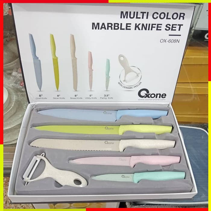 OXONE Marble Knife Set Multi Color OX-608N• 6 Pcs Pisau dengan berbagai fungsi• Tidak berkarat• Tajam• Mudah untuk Pemotongan Sayuran dan Buah Kecil• Dapat memotong berbagai jensi makanan• Mudah digunakan• Bentuk pisau ideal untuk cincang bumbu dan sayuran• Pisau Kokoh dapat digunakan untuk memecah tulang kecil• Sisi Pisau dapat di tekan saat mengupas• Lembut di tangan▪ 1pc 8'; chef knife▪ 1pc 8' slicer knife▪ 1pc 8' bread knife▪ 1pc 5' utility knife▪ 1pc 3.5' paring