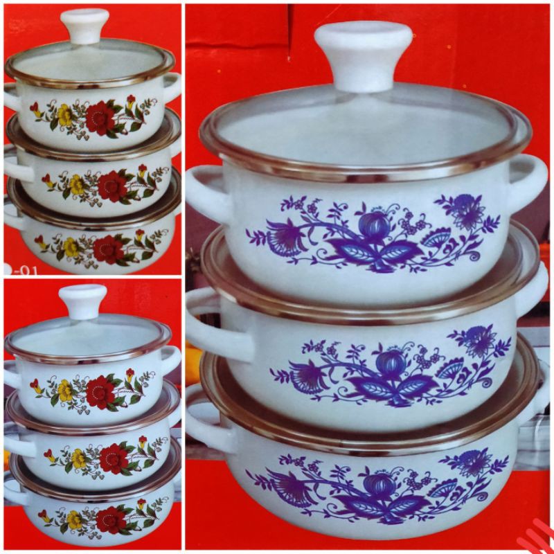 Panci Enamel susun 3 merk " Reona " Dengan 3 ukuran panci, diameter 18cm, 20cm dan 22cm dilengkapi dengan tutup kaca yang elegant ( motif rand