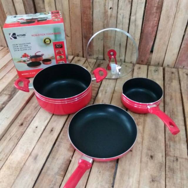 Panci set Kitami T312 :terdiri dari : - 16cm sauce pan- 24cm fry pan- 24cm sauce pot- 24cm glass lid (tutup kaca)bahan teflon. tidak lengket. mudah dibersihkan. bawah panci elemen. sehingga mudah panas dan me