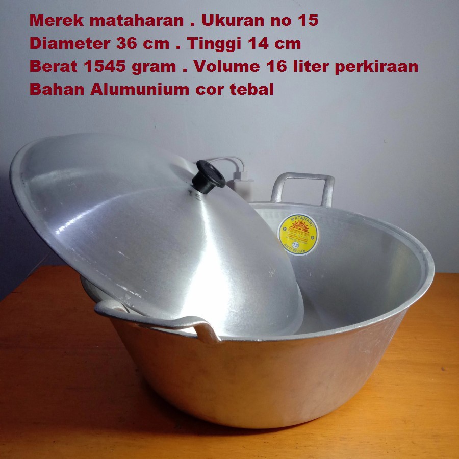 Merek matahariUkuran no 15Diameter 36 cmTinggi 14 cmBerat 1545 gramVolume 16 liter perkiraanBahan Alumunium cor tebal=Merek: Bintang No:15Diameter: 36 cm Tinggi : 15 cm Volume : 9-15 liter (perkiraan)Berat : 1275 gramBahan : Aluminium cor tebal=MEREK1. Bintang2. Bintang satu spesial3. Jempol4. Matahari=KEUNGGULAN1. BAHAN ALUMUNIUM COR TEBAL2. ANTIPECAH3. ANTIKARAT4. ANTIPENYOK5. TAHAN PANAS6. TRADISIONAL ASLI7. MUTU BERSAING=MANFAATCitel atau panci ketel memiliki manfaat / fungsi yang sangat banyak mencakup fungsi fungsi yang dimiliki oleh1. Manfaat / fungsi panci2. Manfaat / fungsi ketel3. Manfaat / fungsi wajan4. Manfaat / fungsi wok5. Manfaat / fungsi pan6. Manfaat / fungsi langseng7. Manfaat / fungsi menanak nasi8. Manfaat / fungsi merebus air9. Manfaat / fungsi memasak sayur10. Manfaat / fungsi menggoreng11. Manfaat / fungsi mengkukus12. dlln.#CITEL #panci #wajan #nasi #wokpan=#panci #ketel #