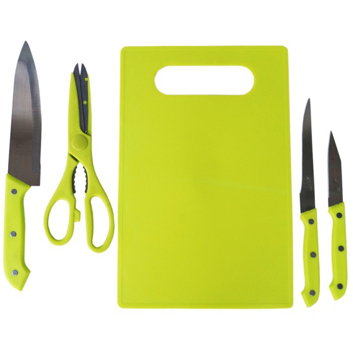TELENAN + PISAU SET {5IN 1}Untuk menjaga pisau tetap tajam dan lebih lama digunakan sehabis memotong bahan makanan disarankan membersihkan menggunakan air panas dan kain lap..Pisau Set Talenan Gunting Dapur talenan set Homey Pisau Dapur1 Set Pisau ini terdiri dari 5 item/barang yaitu :* 1 buah pisau sedang untuk memotong sayur* 1 buah pisau roti* 1 buah gunting* 1 buah telenan * 1 buah pisau kupas buah / s