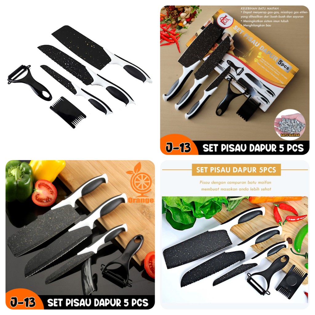 DETAIL PRODUK:Knife Set 5 Pcs + 1 Ceramic Peeler ( J13 )Spesifikasi: J13> 5pcs Knife Set ( Pisau Koki, 8" Pisau Roti, 8" Pisau Slice, 5" Pisau Utilitas, 3.5" Pisau Pengupas ) + 1 Pengupas Lapis Keramik.> Gagang dengan campuran batu maifan> Lapisan lapisan granit> Non Stick Coating Blade.> Dibuat untuk Koki Profesional.> Kemasan Kotak Cantik.> UKURAN PRODUK 31 X 16 X 3> UKURAN PAKET 36 X 21 X 8BERAT 265 GRAMKeunggulan produk:- Dengan mata pisau berbahan dasar Stainless steel yang tajam- Lapisan anti lengket- Pegangan pisau yang tidak licin / anti slip dan ergonomis- Fitur pelindung jari untuk keamanan dan kenyamanan dalam mengenggam- Mata pisau anti bakteri- Lekukan - lekukan di mata pisau, untuk membantu melepaskan bahan makanan yang tipis setelah dip