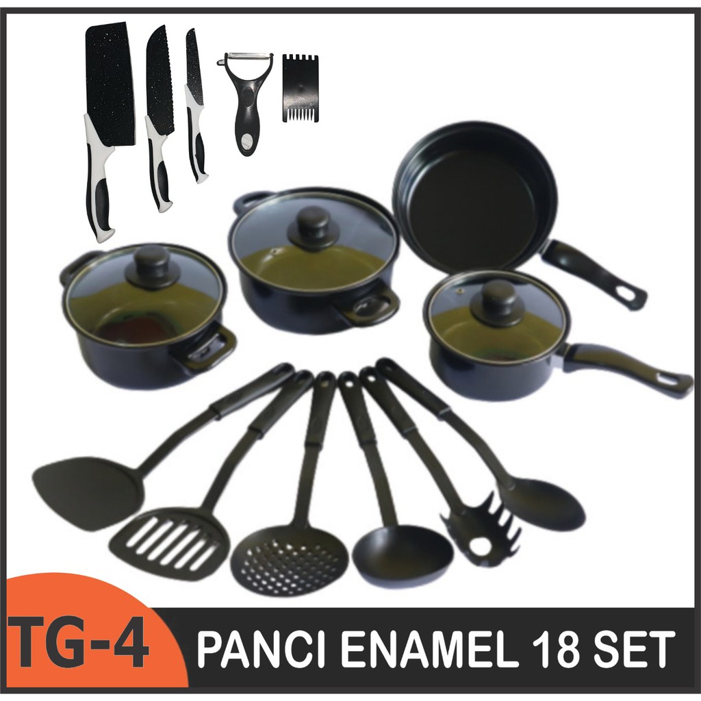 *Panci 18 Set*➡ Terdiri dari- 1 pcs milkpan uk 16cm + tutup kaca- 1 pcs panci uk 18cm + tutup kaca- 1 pcs panci uk 22cm + tutup kaca- 1 pcs frypan uk 22cm- 6 pcs spatula-5 pcs pisau3 Pcs Perlengkapan Dapur Anti Lengket, 1 set untuk melengkapi dapurmuTerbuat dari bahan anti lengket yang dilapisi 4 lapisan yang mudah dibersihkan, lapisan anti gores, lapisan penguatan dan lapisan dasar. Lapisan Permukaannya terbuat dari komponen Alluminium 304, Alluminium Alloy dan Stainless Steel konduksi magnet 403. Cocok untuk menyiapkan sarapan keluarga yang lebih sehat dalam memasaknya.Bisa untuk semua jenis kompor,Tutup Terbuat Dari Kaca Yg Tebal Memudahkan Untuk Melihat Dan Memantau Hasil Masakan. Setiap Tutup Memiliki Pegangan Anti Pa