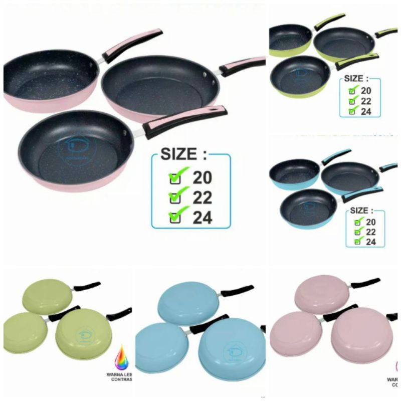 Calypso Frypan 24cm Wajan Penggorengan Anti Lengket Tanpa MinyakKeunggulan Produk :1. Menggoreng tanpa menggunakan MINYAK dan hasil tidak lengket2. Gagang kuat3. Bahan wajan berbentuk seperti granit marmer4. Mudah dibersihkan (hanya cukup menggunakan tangan sdh bisa), tentunya menggunakan sabun ya. ^.^Cara penggunaan wajan/teflon :1. Temperatur tidak boleh lebih dari 200 derajat Celcius.2. Tidak untuk digunakan dalam wajan hanya berisi minyak dengan kurun waktu yang lama / Lihat No1.3. Hindari penggunaan peralatan masak terbuat dari besi/tajam yang terbaik adalah menggunakan peralatan kayu.4. Hindari menggunakan sabut besi (steel wool) saat membersihkan.Cocok di gunakan untuk :1. Menggoreng telur, cumi, tempe, tahu, dan lain lain3. Menumis makananHAPPY SHOPPIN