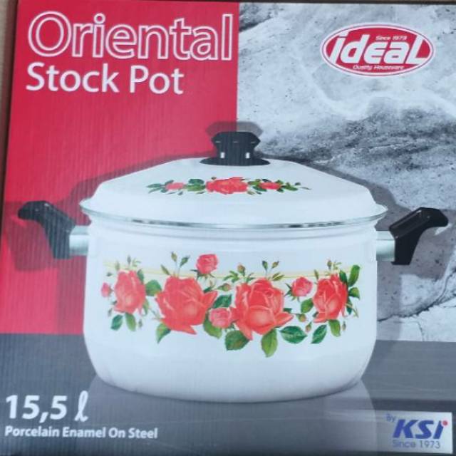 Panci Oriental Stockpot Enamel merk ideal Tersedia dalam ukuran:-30cm-34cm-40cmpanci masak dengan stainless ring yg cocok untuk penggodokan, penggorengan, atau pengkukusan. Design pada stockpot selalu bergambaran bunga(NOTE: design bunga tidak slalu sama dengan yg ada di foto profil produk
