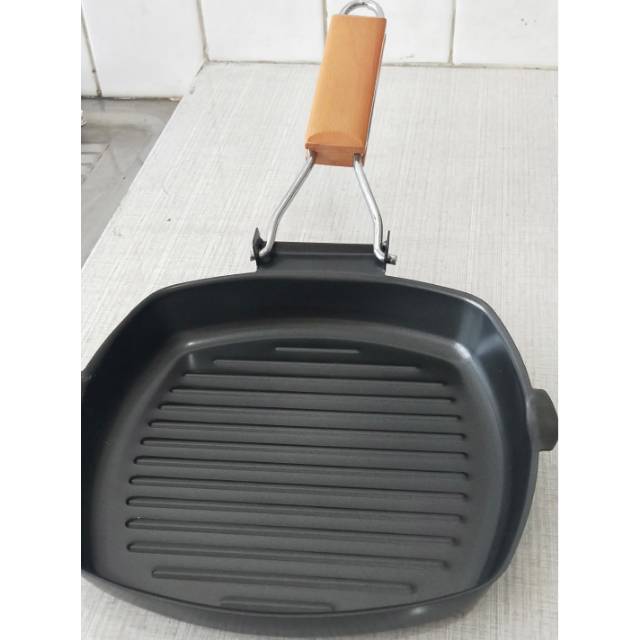 berfungsi memanggang ikan atau steak, membuat telur gulung, wajan teflon halus dan tebal. Gagang handle peredam panas terbuat dari kayu, bukan plastik.dapat dilipat sehingga tidak memakan t