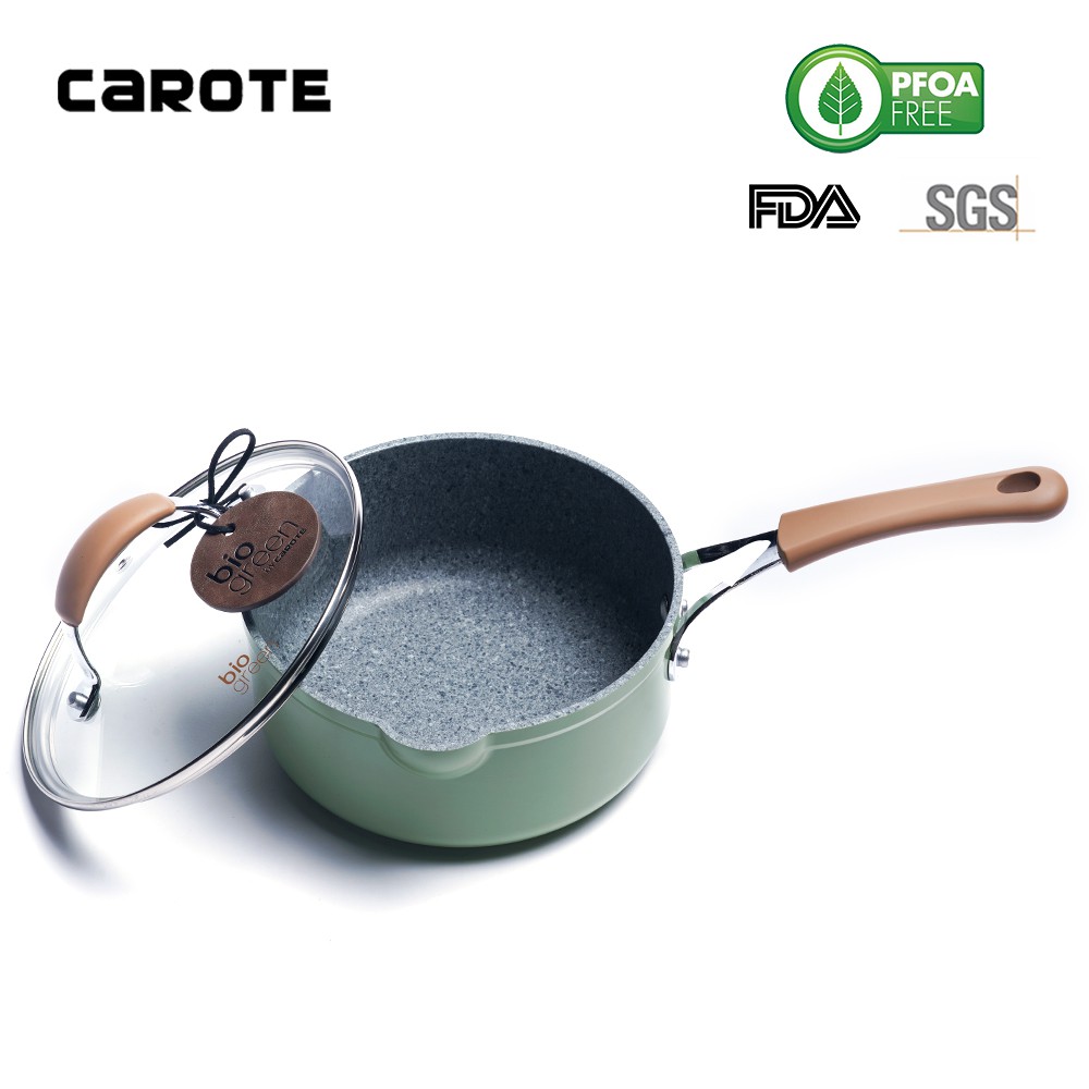 Carote Bio Green Panci Susu Anti Lengket 16/18cm Lengkap dengan Tutup, Bebas PFOA, Lapisan Anti Lengket Impor dari Amerika, Cocok untuk Semua Kompor. PETUNJUK PENGGUNAAN PERTAMA :1. Gunakan sabun cair atau sabun batang, campur dengan air hangat (air biasa juga boleh), dan cuci menggunakan bagian sponge yang halus (berwarna kuning umumnya)2. Lap kering sisa cucian dan rebus air sebanyak setengah volume panci selama 5-10 menit3. Buang air sisa rebusan tadi, dan lap kering lagi4. Tuang 1-2 sendok makan minyak goreng di atas permukaan5. Diamkan beberapa waktu setelah itu bisa memulai memasakJAMINAN KUALITAS :- PRODUK KAMI MENYEDIAKAN JAMINAN KUALITAS SELAMA 1 TAHUN- 15 HARI PENGEMBALIANBagian bawah dengan tebal 4,5mm dapat memberikan distribusi panas yang stabil dan merata selama memasak.COCOK DIGUNAKAN PADA : kompor induksi, kompor gas, kompor keramik, kompor listrik, halogen dan kompor bahan bakar padat. TIDAK DISARANKAN DIGUNAKAN DI DALAM OVEN.Panci susu anti lengket kami tersedia dalam 2 ukuran berbeda untuk kenyamanan Anda: 16 dan 18cm.Panci ini sangat serbaguna, terlebih sangat cocok untuk merebus atau menghangatkan susu dan makanan bayi.Lapisan antilengket batu Whitford Medical yang diimpor dari Amerika: memiliki kemampuan anti lengket yang luar biasa yang dapat memenuhi semua kebutuhan memasak Anda. Lebih sedikit minyak yang dibutuhkan untuk memasak: cocok untuk diet sehat Anda dan teman serta keluarga, dan juga mudah dibersihkan.Total ada 5 lapisan untuk lapisan anti lengket: lapisan anti lengket akan bertahan untuk waktu yang sangat lama.Bebas PFOA, Timbal dan Kadmium: panci dan wajan kami telah lulus uji FDA dan memperoleh sertifikasi SGS untuk menjamin keamanannya.Bodi terbuat dari aluminium: bobot yang sangat ringan dipadukan dengan bodi yang kokoh. Panci anti lengket anda tidak akan mudah bengkok. Desain pegangan bakelite dan baja tahan karat berbentuk Y yang ergonomis dan lembut: Panggangan anda dapat digunakan dengan nyaman untuk waktu memasak yang