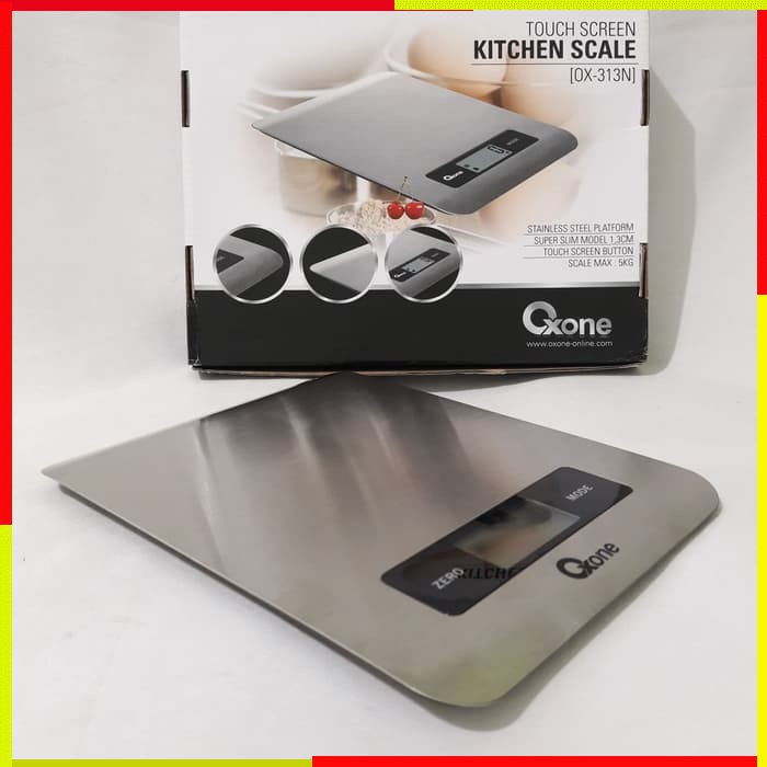 OXONE Timbangan Dapur Touchscreen 5 Kg OX313NSpesifikasi - Stainless Steel Platform- Super Slim Model 1.3cm- Touchcreen Button- Scale Max 5 Kg- High Accurcy- Indicate volume of water and milk- Two weight unit system g, lboz convebrtible- Two volume unit system ml, fl'oz convertible- Low battery power/overload indication- With high precision strain gauge sensor- With tare function- Auto Off- Include 1x3v CR2032 lithium batteriesProduk Terbaru dari Oxone, Touchscreen Kitchen Scale. Dengan bahan stainless steel berkualitas dan desain yang super slim, timbanga dapur oxone ini menjadi pilihan yang tepat untuk dapur minimalis anda.Dengan Tekhnologi layar sentuh, timbangan dapur oxone ini sangat mudah dioperasikan dengan tingkat akurasi yang tinggi. Bagi anda yang suka membuat kue/roti, timbangan dapur oxone ini sangat cocok.Kapasitas maksimal yang dianjurkan adalah 5kg dengan penghitungan sampai satuan gram.Timbangan dapur digital Oxone ini juga dapat mengukur volume air/susu dan juga fitur auto off sehingga menhemat pemakaian baterai anda.Dalam paket pembelian sudah disertakan baterai 3v CR2032 lithium (lepaskan pengaman baterai sebelum digunakan).Miliki timbangan dapur oxone dengan tekhnologi layar sentu agar kegiatan di dapur menjadi lebih mewah dan menyenan