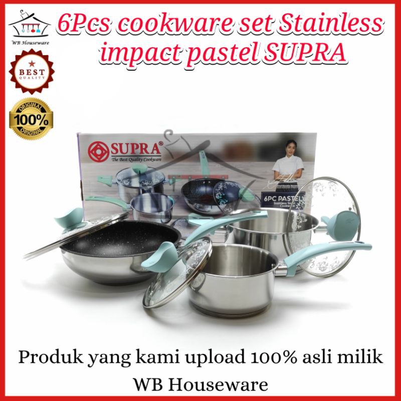 Deskripsi 6 Pcs Impact Stainless SupraSelamat datang di WB Houseware, Selamat Berbelanja Nikmati mudahnya berbelanja dengan memilih produk yang lengkap, murah dan keamanan barang terjaminPENGIRIMAN : BUBBLE + DUS + FRAGILE (FREE!!!)Kini panci set serbaguna hadir dengan kombinasi yang sangat cantik terbuat dari bahan stainless steel dengan warna pastel. Bagian bawah panci set ini memiliki impact buttom support kompor induksi yang berfungsi sebagai pengantar panas yang merata ketika anda masak menggunakan panci set ini. Dengan kombinasi stainless dengan gagang warna pastel yang sangat cantik memperindah tampilan panci,Stir wok 24 cm terdapat lapisan anti lengket yang memudahkan anda dalam menumis / mengoreng makanan menjadi lebih mudah tanpa harus kesal karena bahan makanan yang menempel didalam pengorengan. Peralatan dapur ini sangat mudah untuk digunakan dan sangat mudah untuk dibersihkan.Spesifikasi Produk :1 pcs sauce pan : 16 cm1 pcs dutch oven : 20 cm1 pcs nonstick stir wok : 24 cm1 pcs glass Lid : 16 cm1 pcs glass lid : 20 cm1 pcs glass lid : 24 cmDengan harga terjangkau Anda sudah bisa memiliki alat ini karena kami jual alat ini dengan harga yang murah !Ayoo.. segera miliki alat ini hanya ditoko kami. Dijamin barang 100% Original kualitas terjamin !